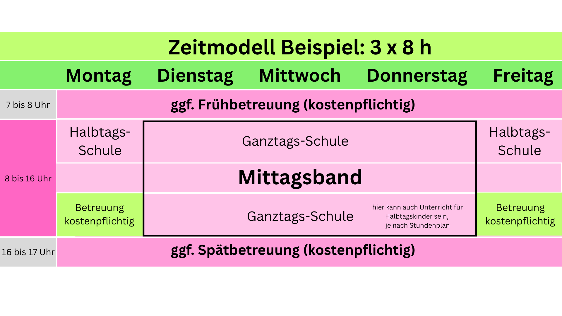Der Rechtsanspruch liegt bei 8h bei 5 Werktagen, doch wir als Schulträger – die Grundschulen haben als Schulträger die Gemeinde – haben verschiedene Zeitmodelle die wir im Ganztag als kostenfreie Betreuung anbieten können: